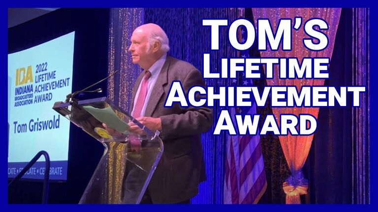 Tom Griswold accepts his lifetime achievement award from the Indiana Broadcasters Association. He is introduced by IASB's Scott Uecker.